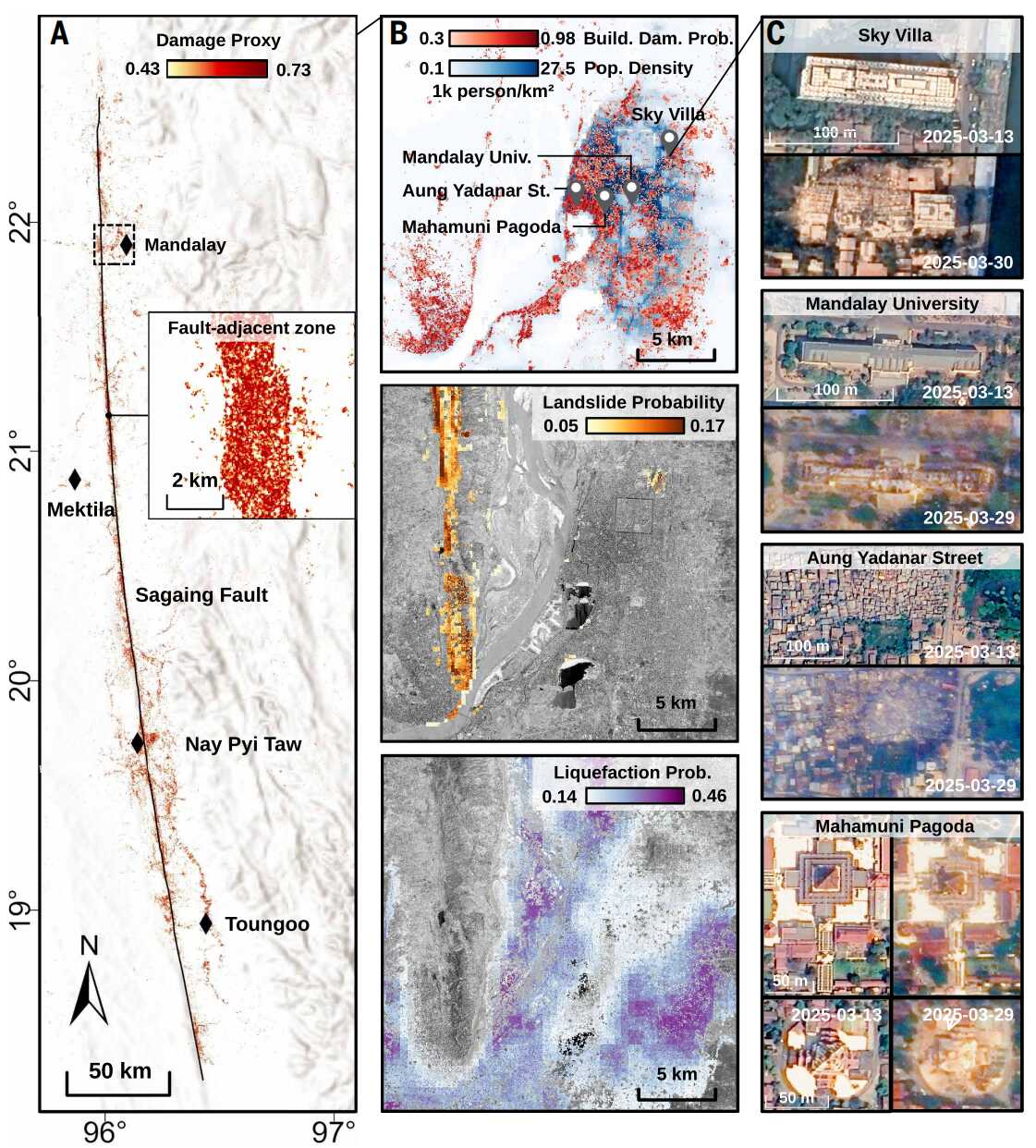 Beyond rupture dynamics, AIRCAS researchers also conducted satellite-based damage assessments, which are concentrated along the fault, especially in urban areas such as Mandalay. Combined with high-resolution optical images from satellites including Jilin-1 and Gaofen series, the team identified the spatial distribution of secondary hazards, such as building collapses, soil liquefaction, and landslides.