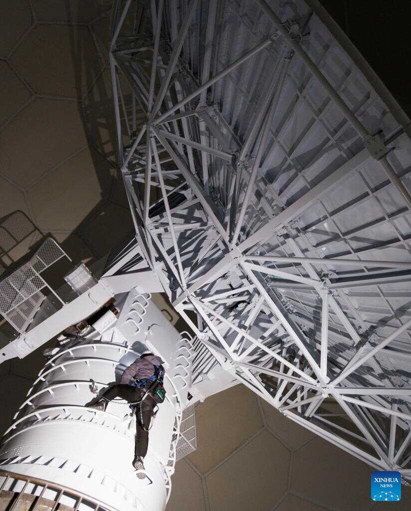Shi Shengpu, director of the Mohe Station of the China Remote Sensing Satellite Ground Station, performs maintenance tasks inside the central structure of the antenna at the station in Mohe, northeast China's Heilongjiang Province, on Jan. 25, 2026. (Xinhua/Jin Liwang)