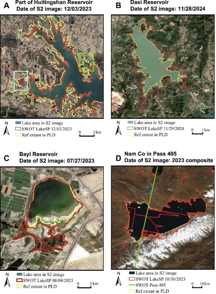 Lake extent derived from SWOT L2 HR LakeSP data compared to Sentinel-2 optical images in case lakes. (Image by AIRCAS)